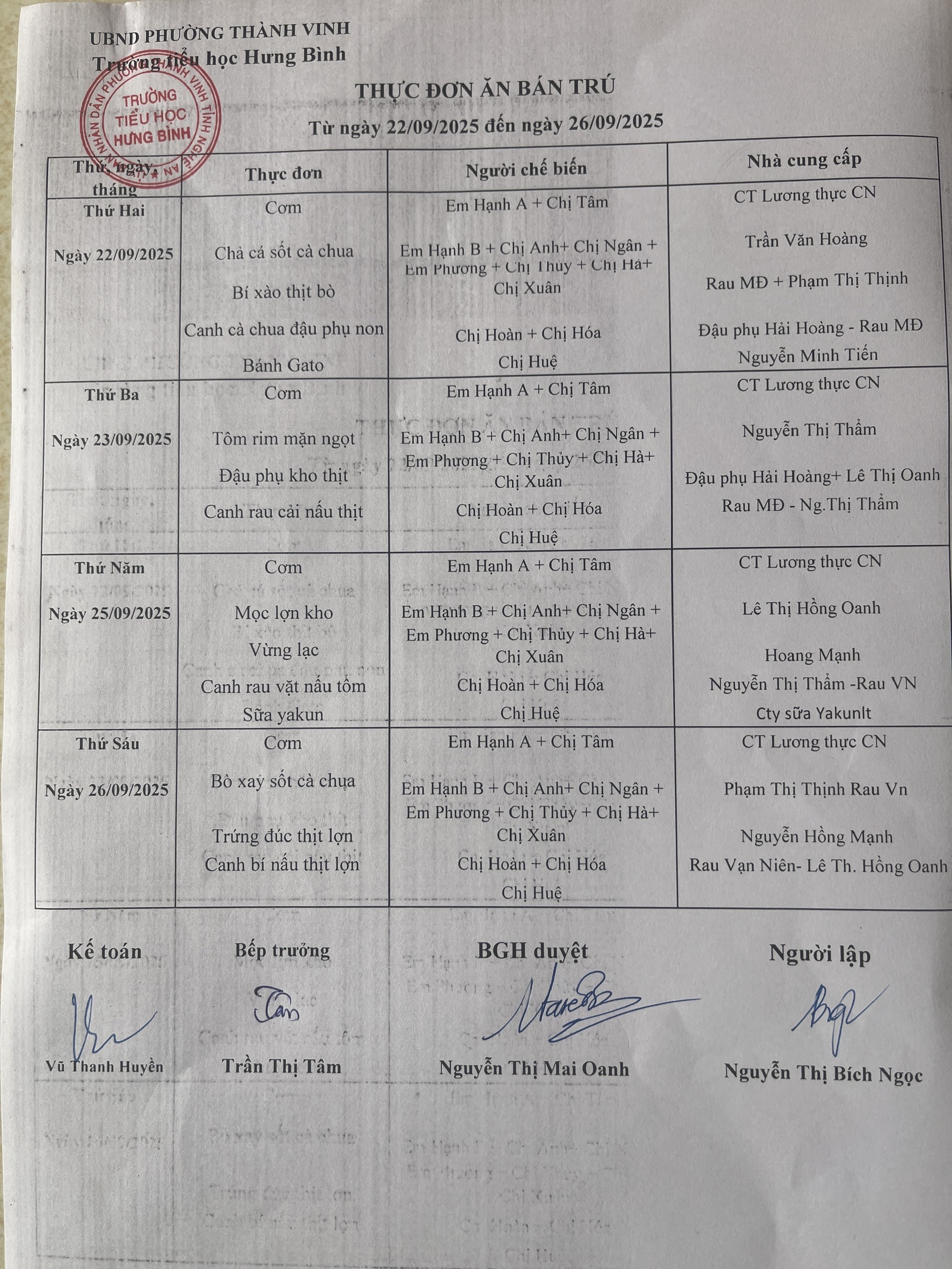 Về việc phê duyệt kết quả lựa chọn các nhà thầu: "Cung cấp thực phẩm tươi sống, hàng khô, rau, chất đốt, nước uống phục vụ cho học sinh tại trường TH Hưng Bình" Năm học 2025-2026