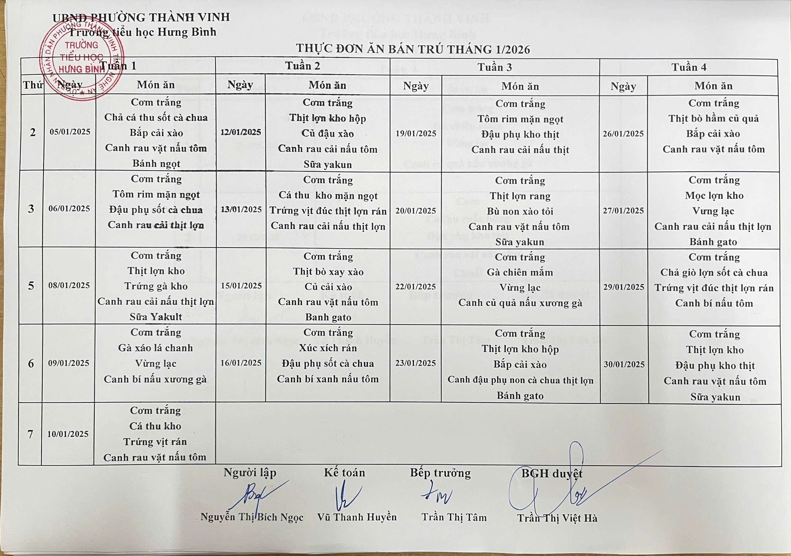 Thực đơn ăn bán trú tháng 1 năm học 2025-2026