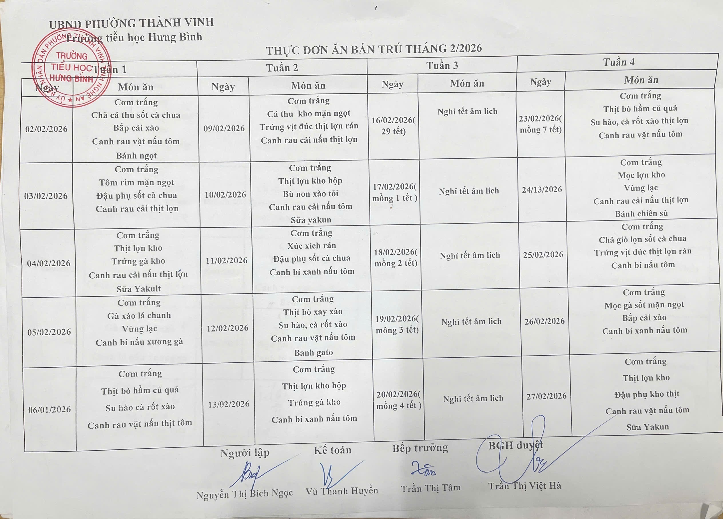 Thực đơn ăn bán trú tháng 2 năm học 2025-2026