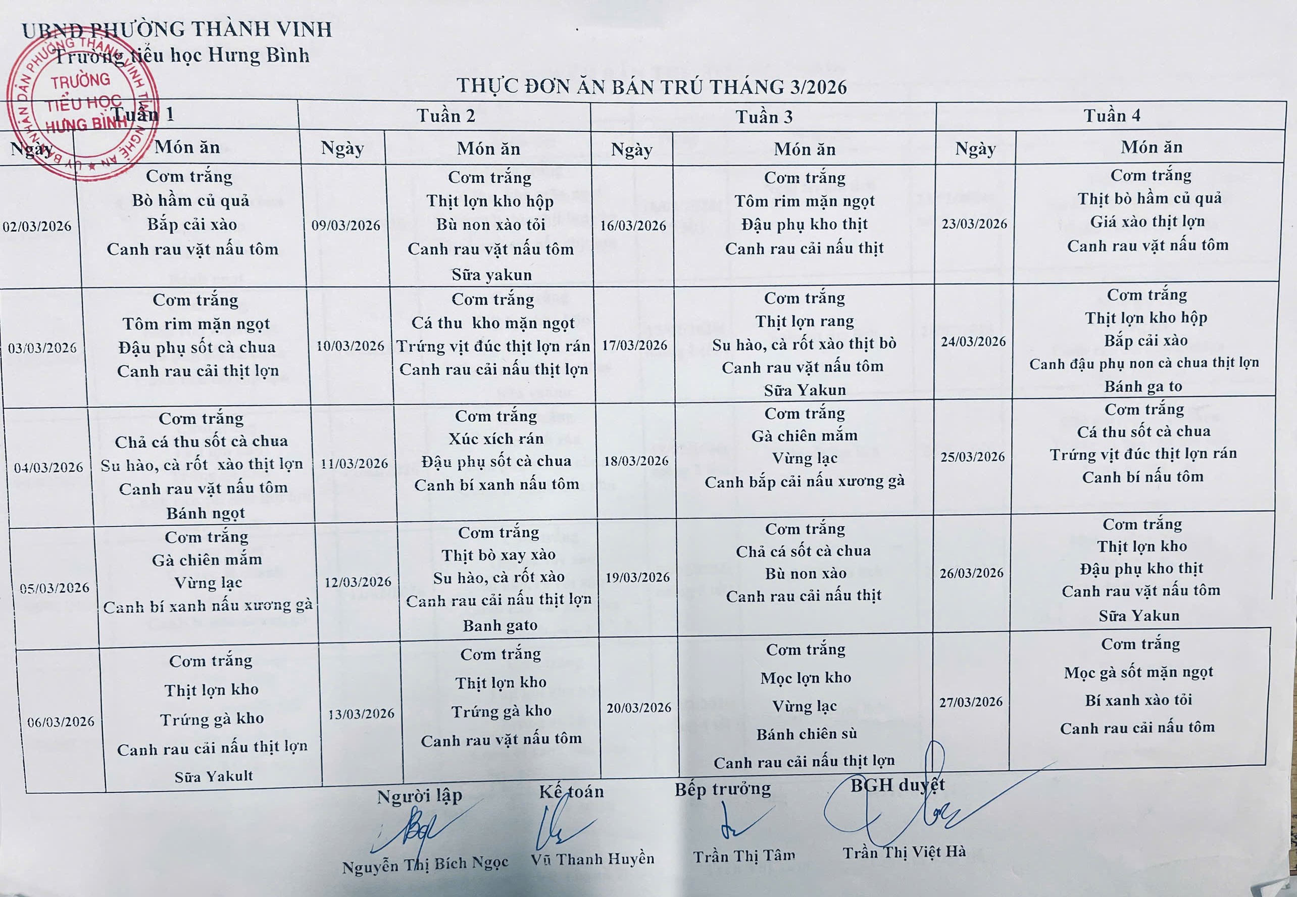Thực đơn ăn bán trú tháng 3 năm học 2025-2026